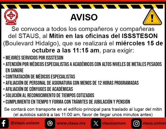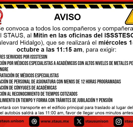 - Convoca STAUS a mitin en las oficinas del ISSSTESON