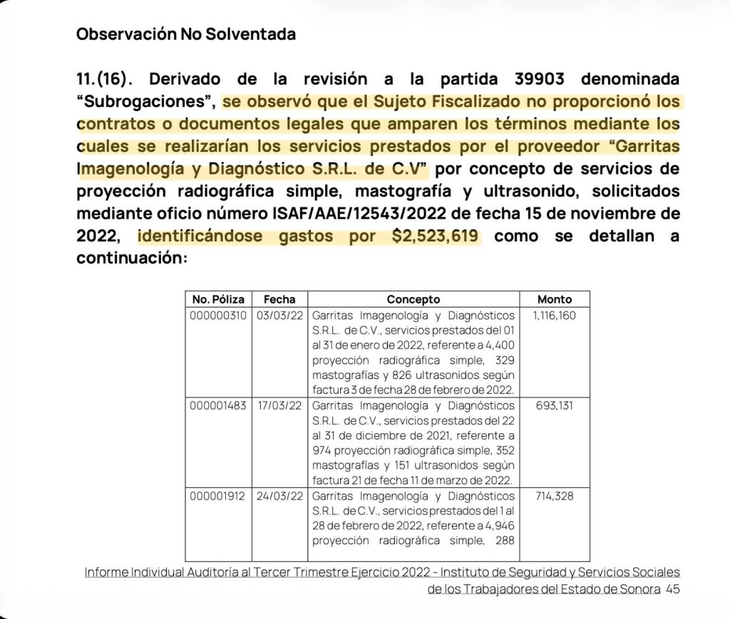Una de las observaciones más delicadas que el ISAF ha señalado y que no ha sido solventada por el Instituto es la referente a un pago de más de $2.5 millones de pesos a una entidad llamada “Garritas” (sí, “Garritas”), supuestamente proveedora de servicios de imagenología.