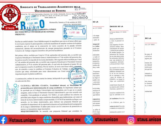 El STAUS a través del Mtro. Cuauhtémoc Nieblas Cota, Secretario General, entregó el lunes 13 de octubre un tercer oficio a la Dra.
