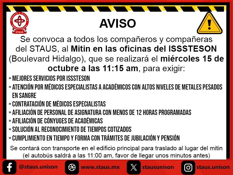 El STAUS convoca a todas y todos sus agremiados al Mitin que realizará este miércoles 15 de octubre a las 11:15 a.m., en las oficinas administrativas del ISSSTESON, ubicadas sobre Boulevard Hidalgo, para exigir mejores servicios, atención por médicos especialistas a académicas(os) con altos niveles de metales pesados en la sangre, contratación de especialistas, afiliación a personal de asignatura con menos de 12 horas programadas, afiliación de conyugues de académicas, solución al reconocimiento de tiempos cotizados y cumplimiento en tiempo y forma de los trámites de jubilación y pensión.