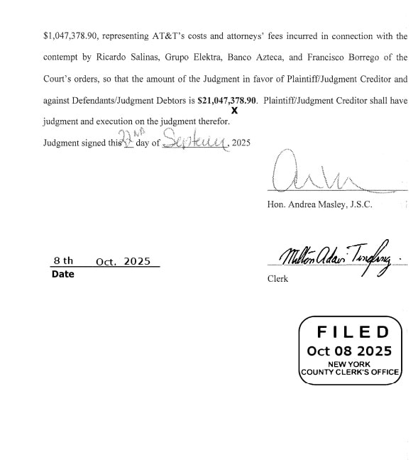 La Suprema Corte del Estado de Nueva York ha formalizado hoy, 8 de octubre de 2025, una sentencia de desacato civil en contra del empresario mexicano Ricardo Salinas Pliego, junto con Grupo Elektra, Banco Azteca y Francisco Borrego. La decisión, emitida por la jueza Andrea Masley, establece una condena de pago solidario que asciende a USD $21,047,378.90. Este monto se compone de una multa de USD $20 millones más USD $1,047,378.90 por concepto de honorarios legales, en el marco del expediente AT&T Mobility Holdings B.V. vs. Grupo Salinas Telecom.