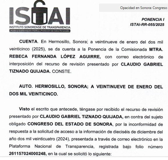 Dado que la respuesta inicial del Congreso fue negligente e indiferente, opté el pasado 28 de enero por presentar un Recurso de Revisión ante el Instituto Sonorense de Transparencia, Acceso a la Información y Protección de Datos Personales (ISTAI), conforme al Artículo 138 de la Ley de Transparencia estatal.