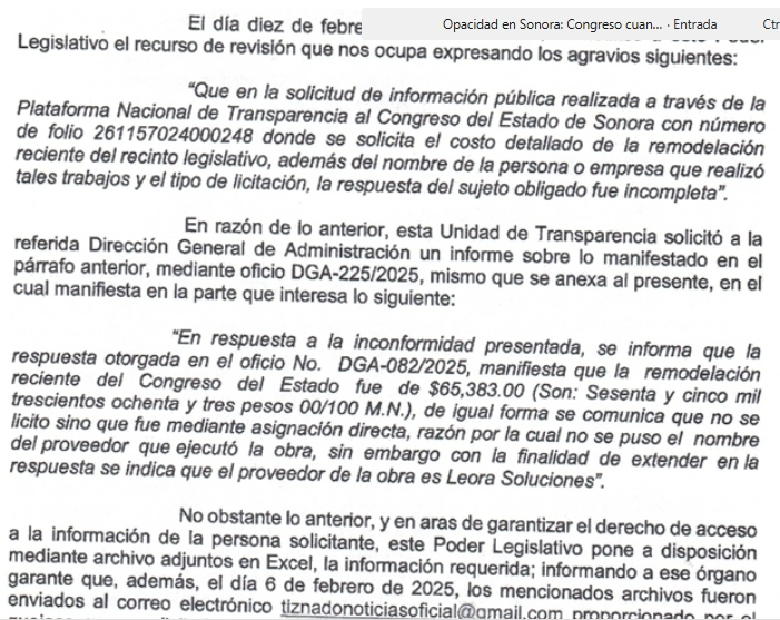 Al cumplirse el plazo, el representante legal del Congreso rindió un informe justificado. Este informe se limitó a confirmar ante el ISTAI la misma cantidad de $65,383.00 pesos como costo de la obra (sin adjuntar ninguna documentación probatoria) e identificó a la empresa proveedora como “Leora Soluciones” que tras un rastreo periodístico se identificó que ya fue beneficiada con adjudicaciones directas en años anteriores.