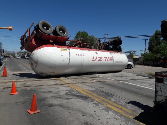 Dicho tractocamión propiedad de la empresa distribuidora de gas Tomza, transportaba dos remolques tipo tanque con capacidad de 20 mil litros de gas LP cada uno, aproximadamente.