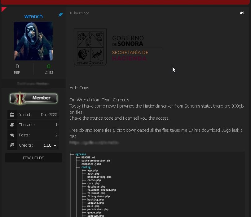 Hermosillo, Sonora. — La seguridad digital del Gobierno de Sonora ha sido comprometida. El grupo de hackers conocido como “Team Chronus” ha puesto a la venta el acceso a la infraestructura digital de la Secretaría de Hacienda, lo que ha escalado de un problema técnico a una grave crisis de gobernabilidad. La filtración, que supuestamente contiene 50GB de archivos, no solo confirma fallas en los sistemas de protección de datos, sino que revela información confidencial sobre las decisiones financieras, los litigios en curso y las prioridades de gasto de la administración estatal al cierre de 2025.