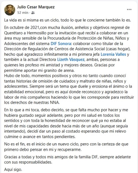 El texto de Márquez no es una despedida definitiva, sino la aceptación de un cambio de ciclo. Agradece a quienes le abrieron las puertas en el DIF Sonora, reconoce la labor de sus compañeros en la restitución de derechos y, lo más importante, se reafirma en la certeza de que “primero debo pensar en mí y recuperarme”.